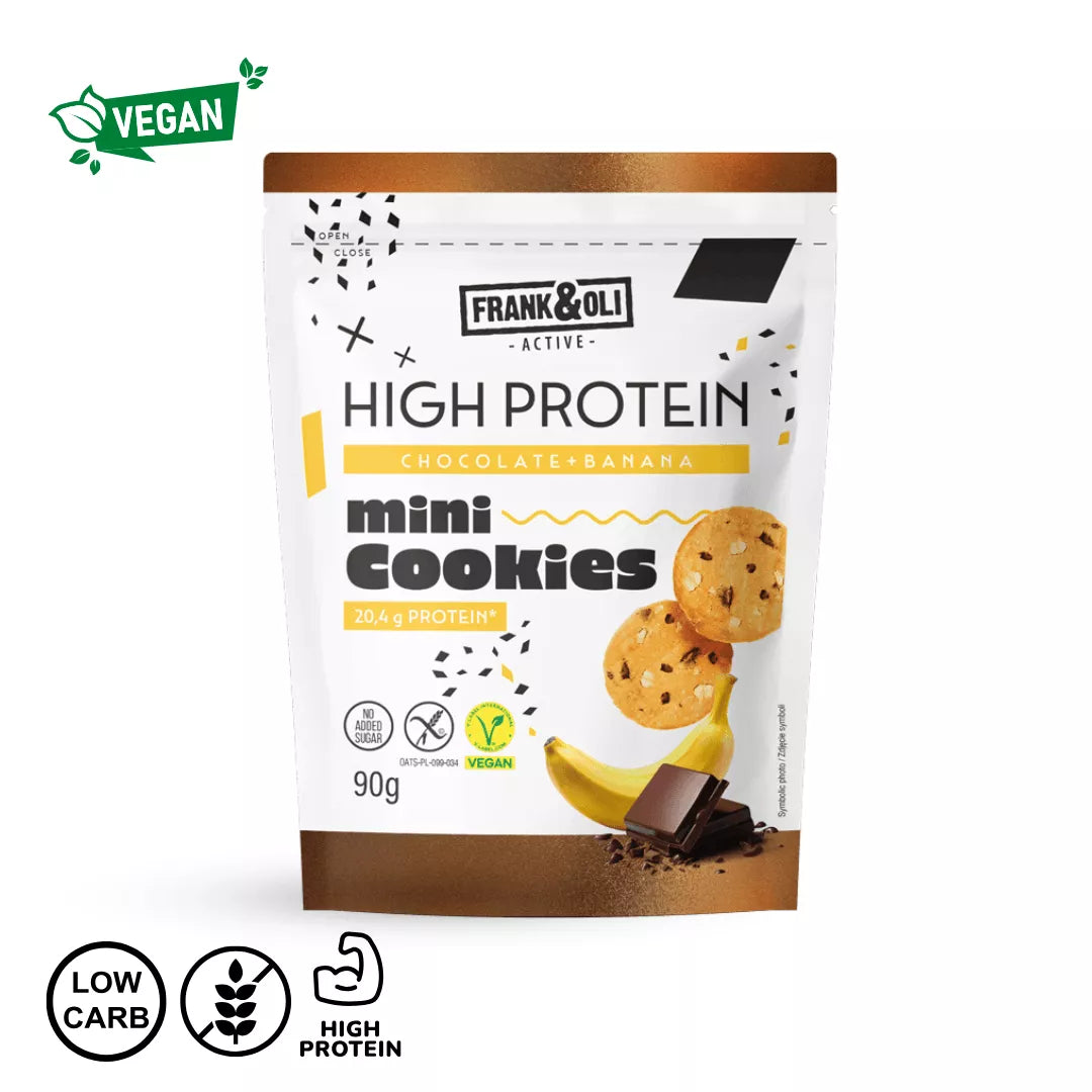 Proteinski mini kolačići Banana & Čokolada Frank&Oli hrskavi su, ukusni i puni proteina i vlakana. Savršen izbor za brzi zalogaj kod kuće, na poslu, nakon treninga ili u pokretu.